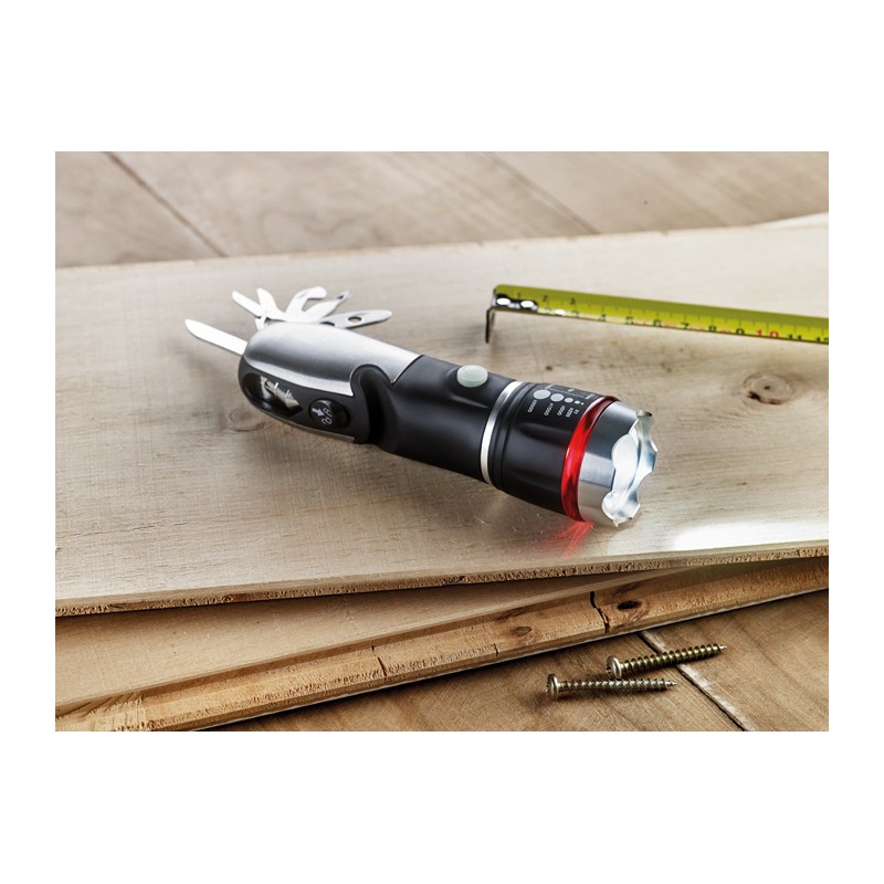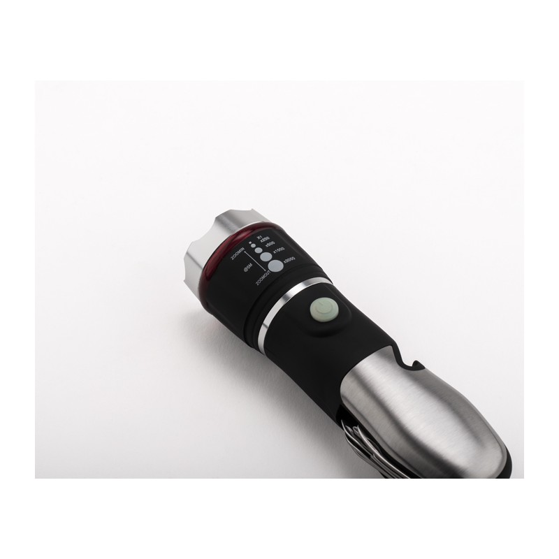 Multiherramientas con soplete, martillo de seguridad y cúter. Incluye 9 funciones de herramienta. Fabricado de acrilonitrilo butadieno estireno con acabado engomado. 3 configuraciones de luz con función de zoom. 3 pilas AAA no incluidas.