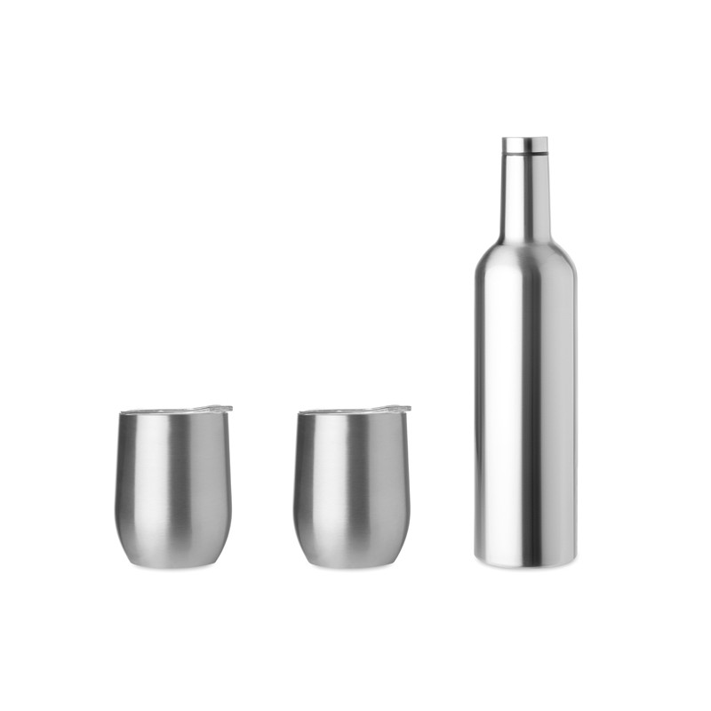 Juego de vino que cuenta con: botella térmica fabricada de acero inoxidable, construida de doble pared y capacidad de 750 ml. Incluye: 2 copas térmicas fabricadas de acero inoxidable, construidas de doble pared y capacidad de 350 ml.