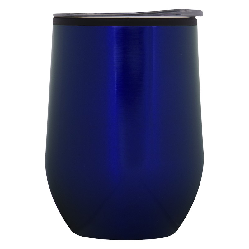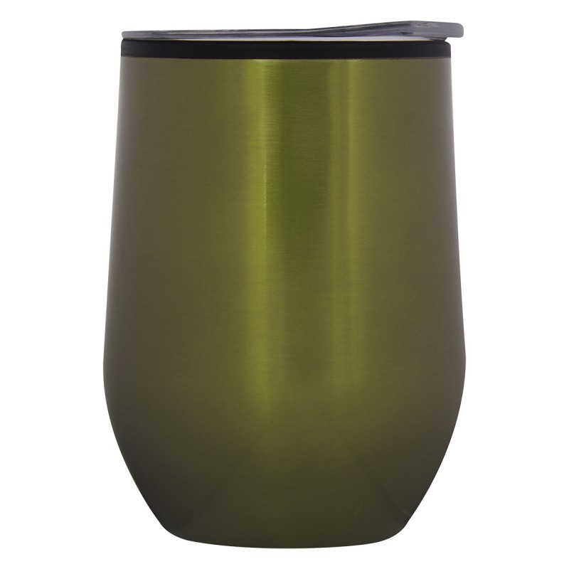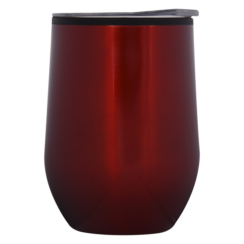 Vaso para vino fabricado con un revestimiento interior de plástico y exterior de acero inoxidable. Capacidad de 12 Oz. Tapa para sorber a presión. Base antiderrapante. Cumple con los requisitos de la FDA y está libre de BPA. Se recomienda lavar a mano.