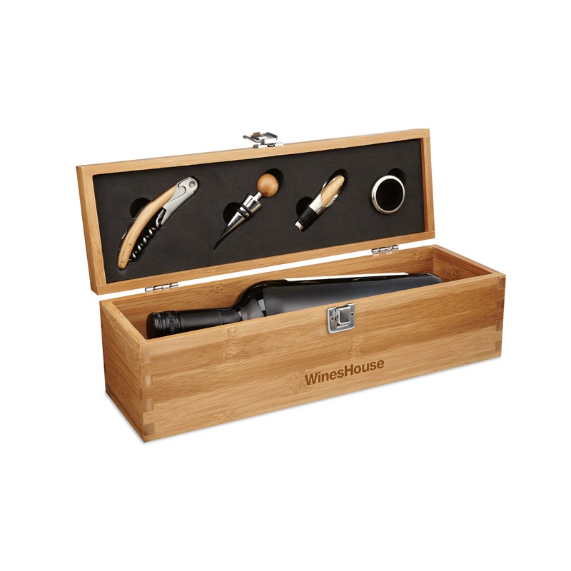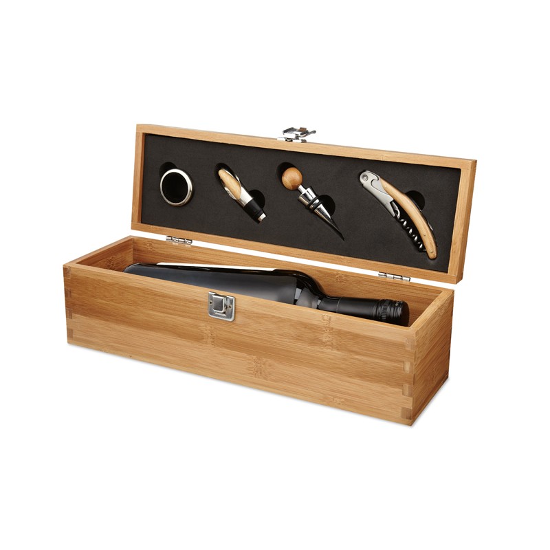 Juego de vino en caja fabricada de bambú con espacio para una botella de vino. Incluye: cuello de botella, vertedor, tapón y sacacorchos. Botella de vino no incluida. El bambú es un producto natural, puede haber ligeras variaciones de color y tamaño por artículo, lo que puede afectar el resultado final de la decoración.